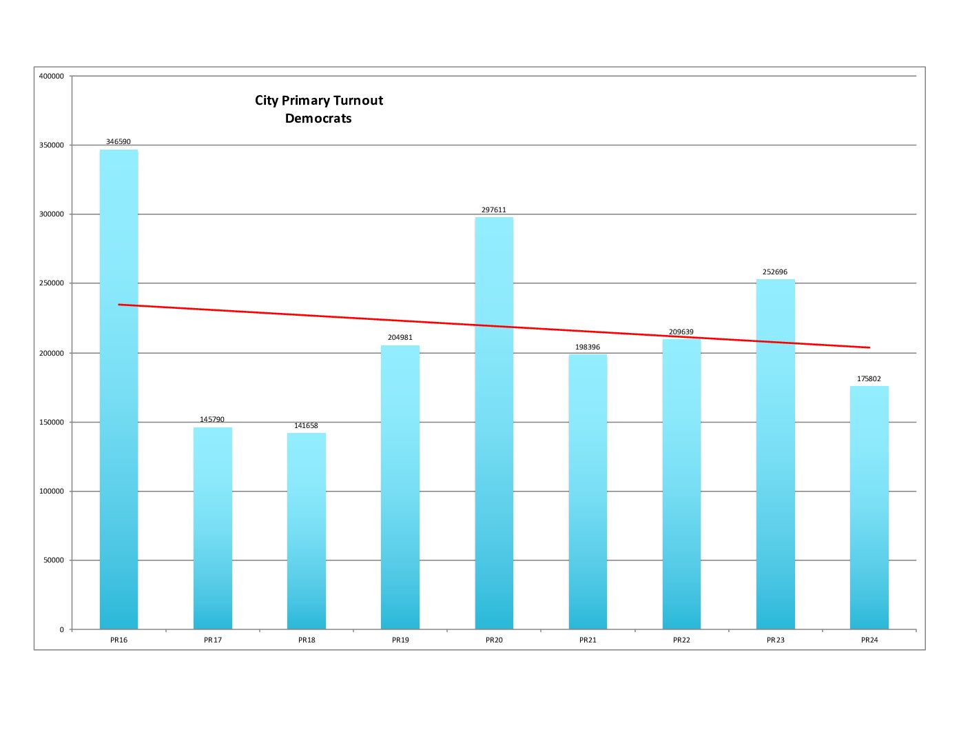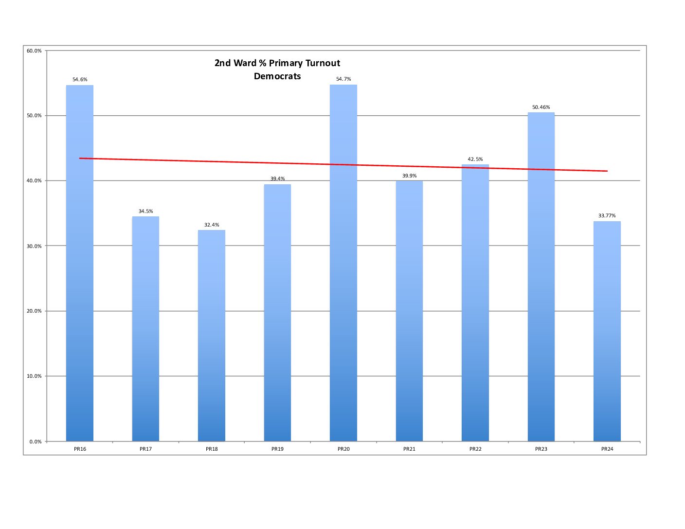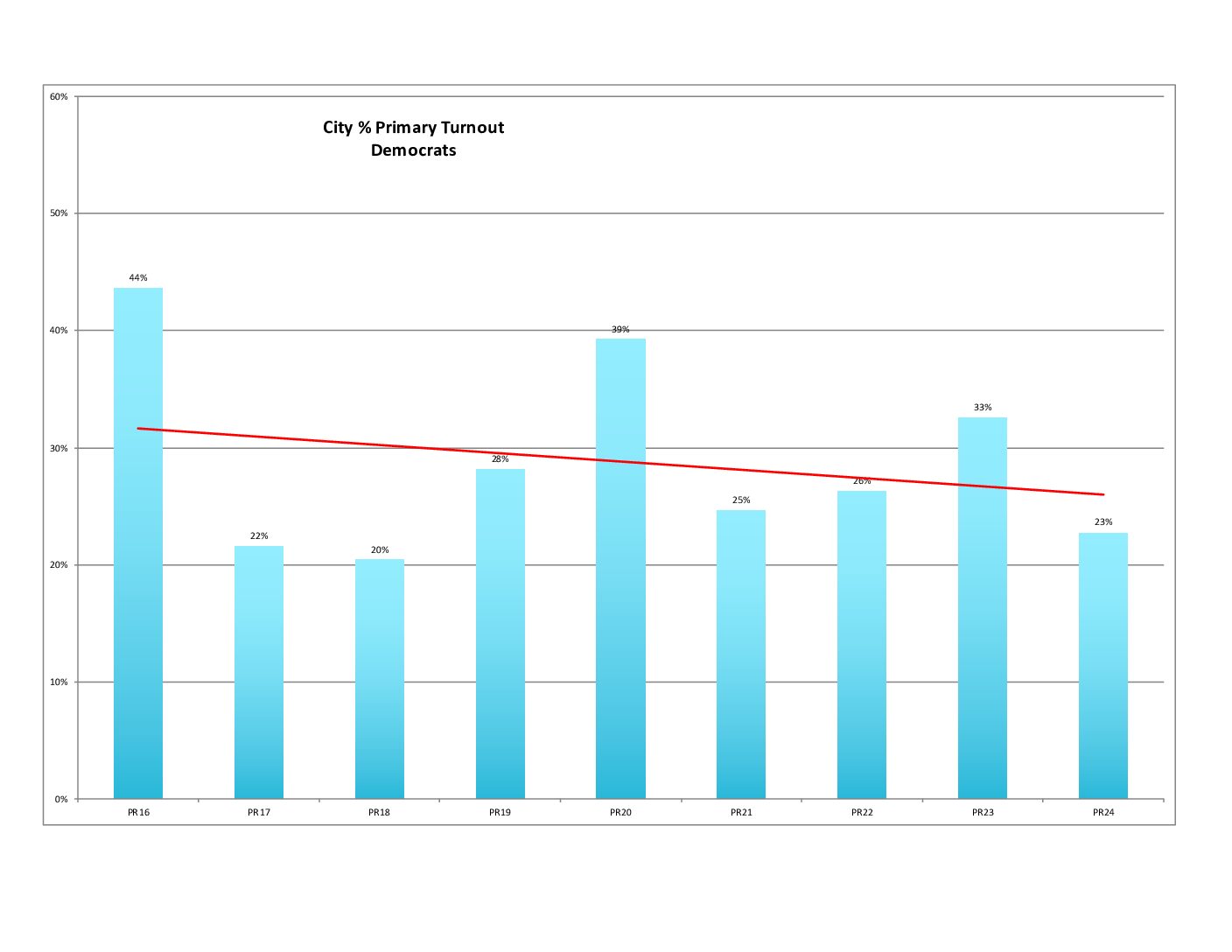 Unfortunately, we are in a downward trajectory for percent voter turnout. (The 2016 and 2020 Primaries show what we can do.)