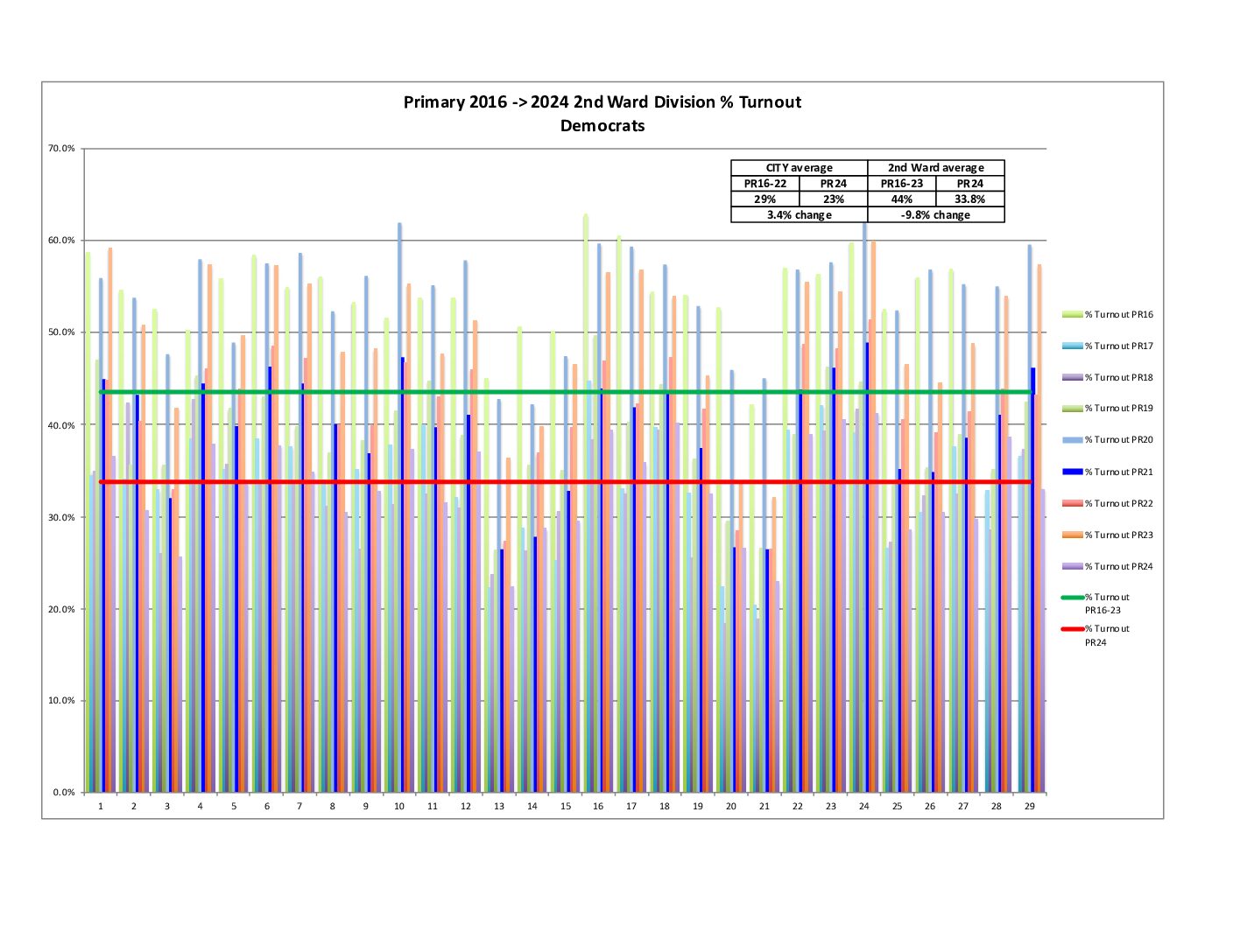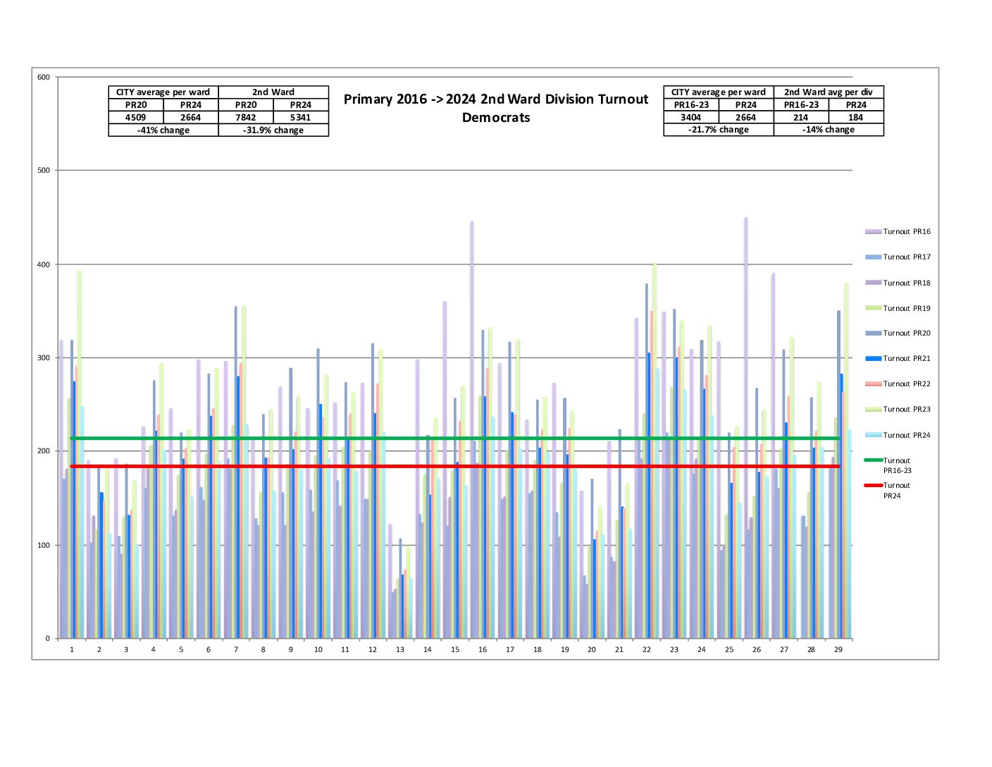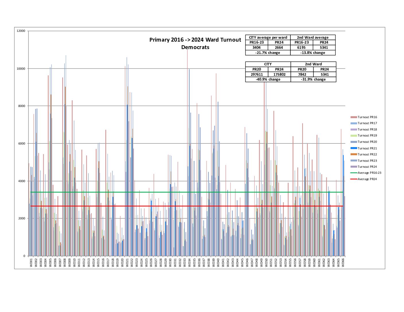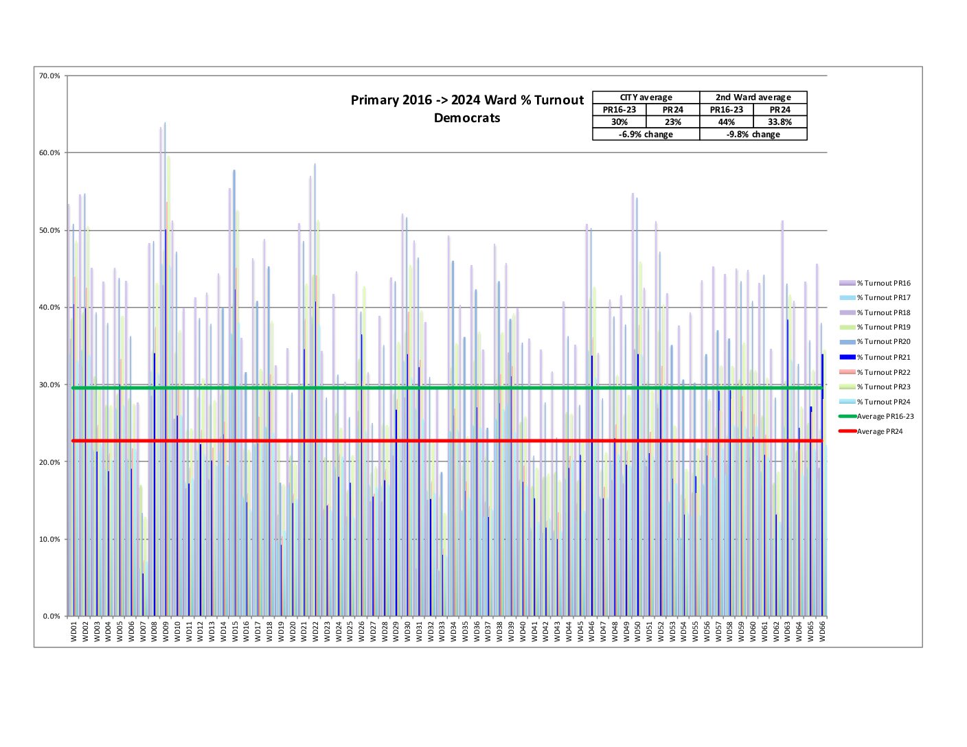 Also, both the city and 2nd Ward are showing a decrease in raw voter turnout compared to the average of 2016-2023 Primaries.