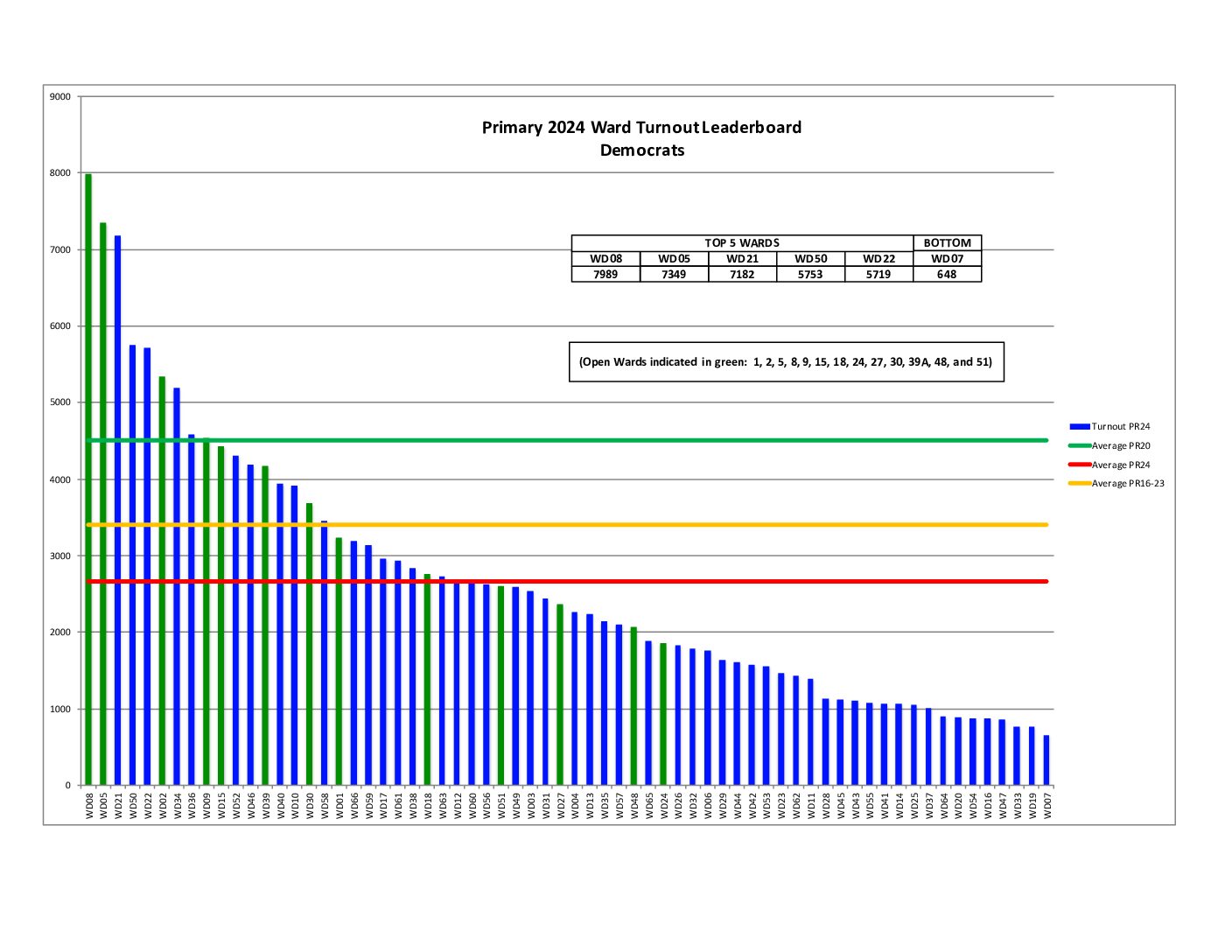 We came in 5th in the city, almost tying for 4th, and only about 4% away from the 15th Ward in 2nd place. (Please note the Open Wards shown in green. What’s an Open Ward?)