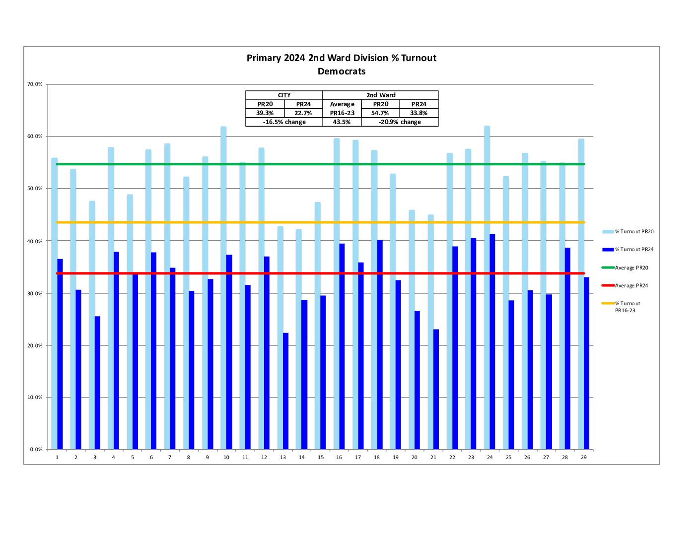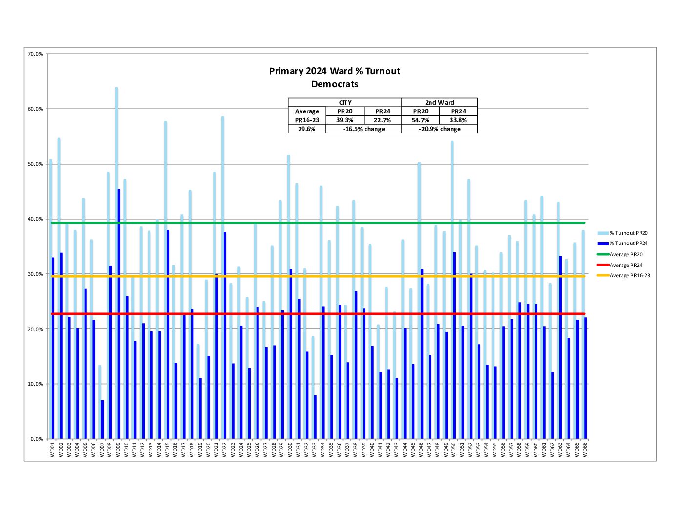 Both the city and 2nd Ward are showing a decrease in percent voter turnout compared to the average of 2016-2023 Primaries.