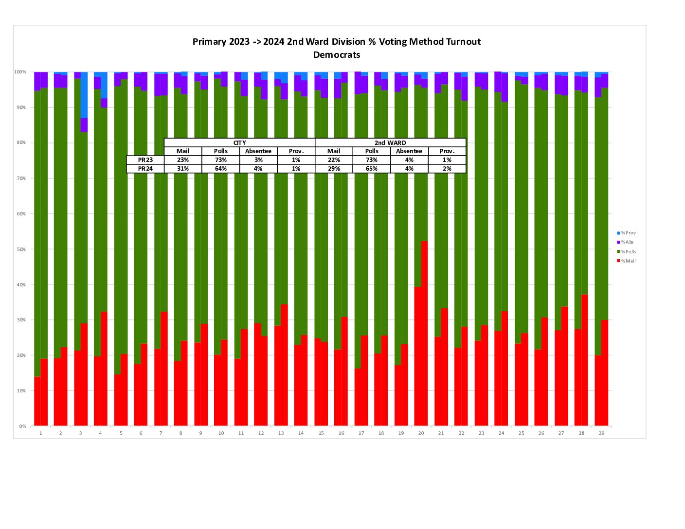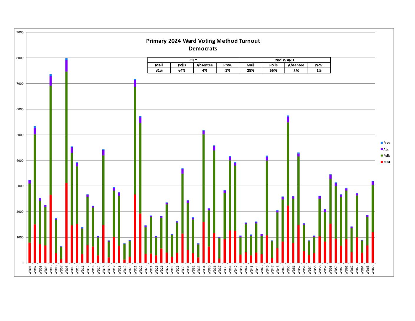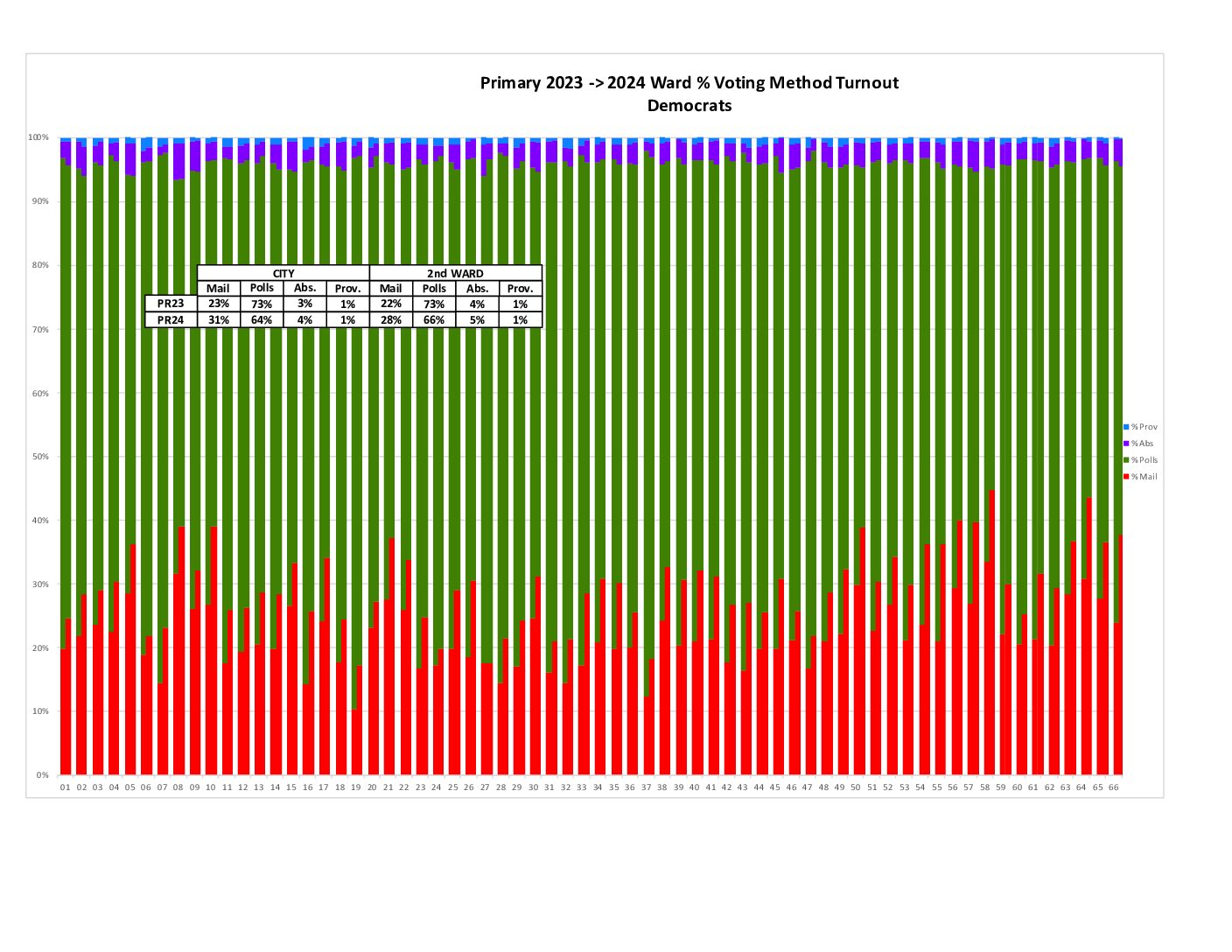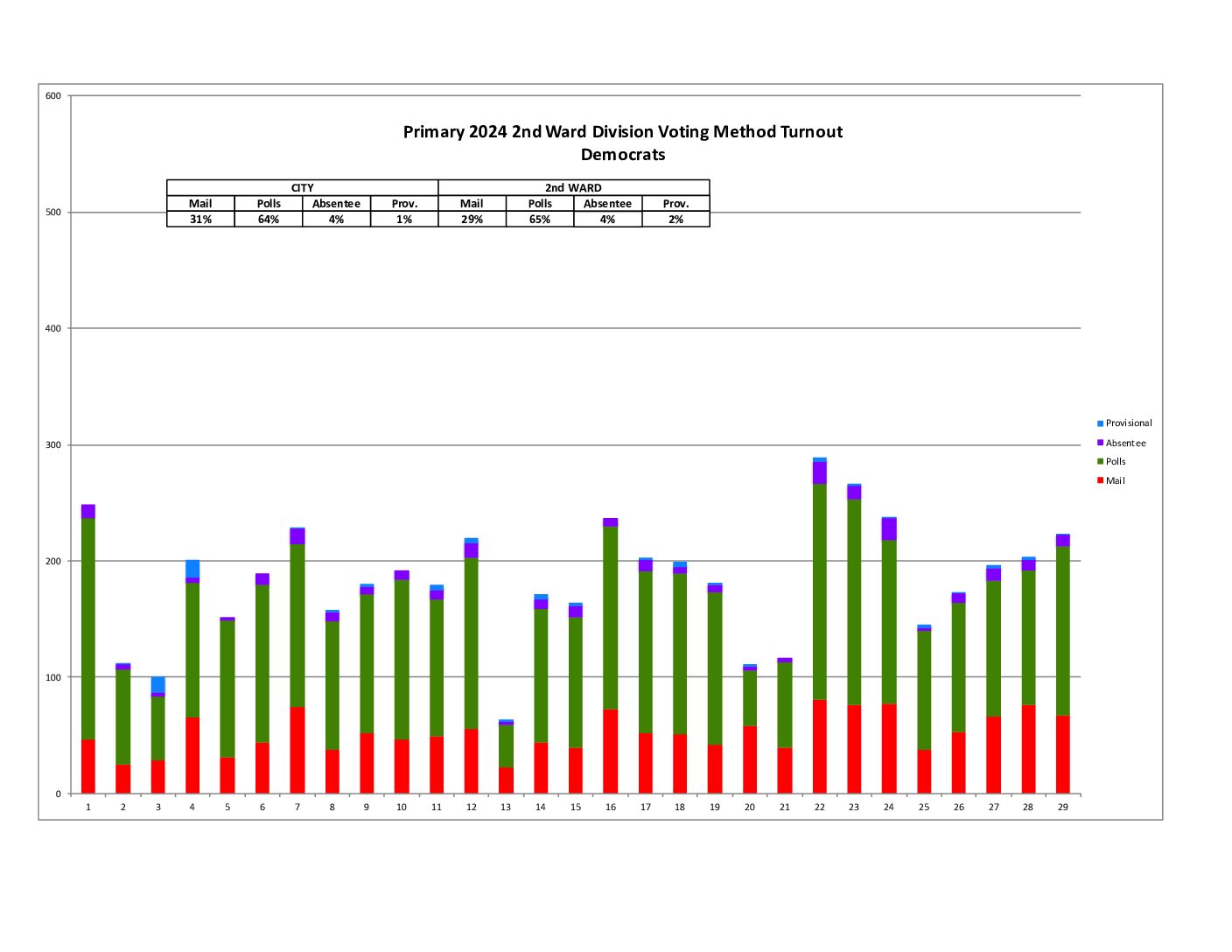 This shows the raw number of votes cast per ward broken into Mail, At Polls, Absentee, and Provisional. The 2nd Ward generally matched the city in terms of voting method.