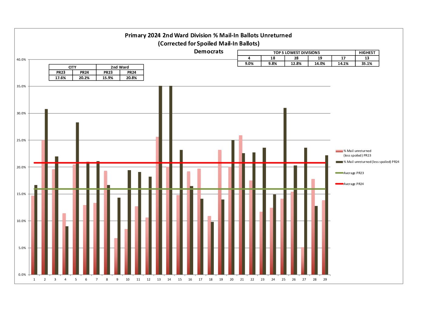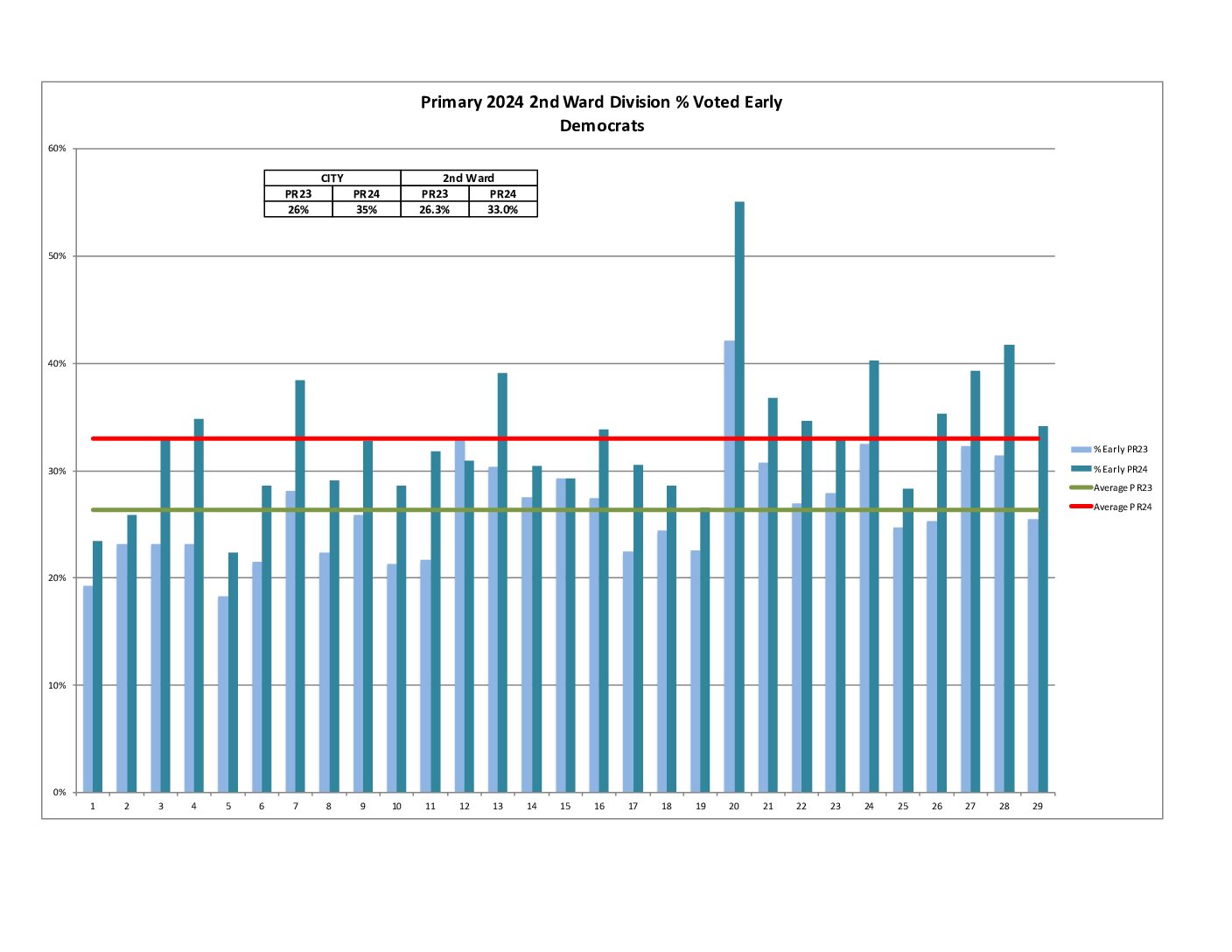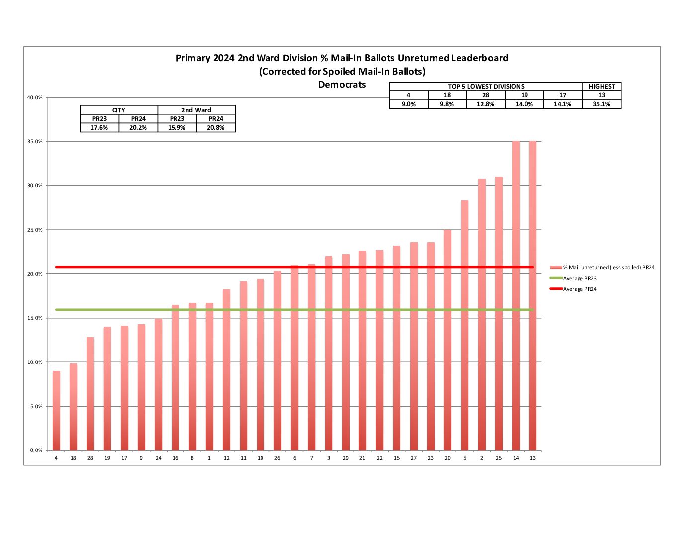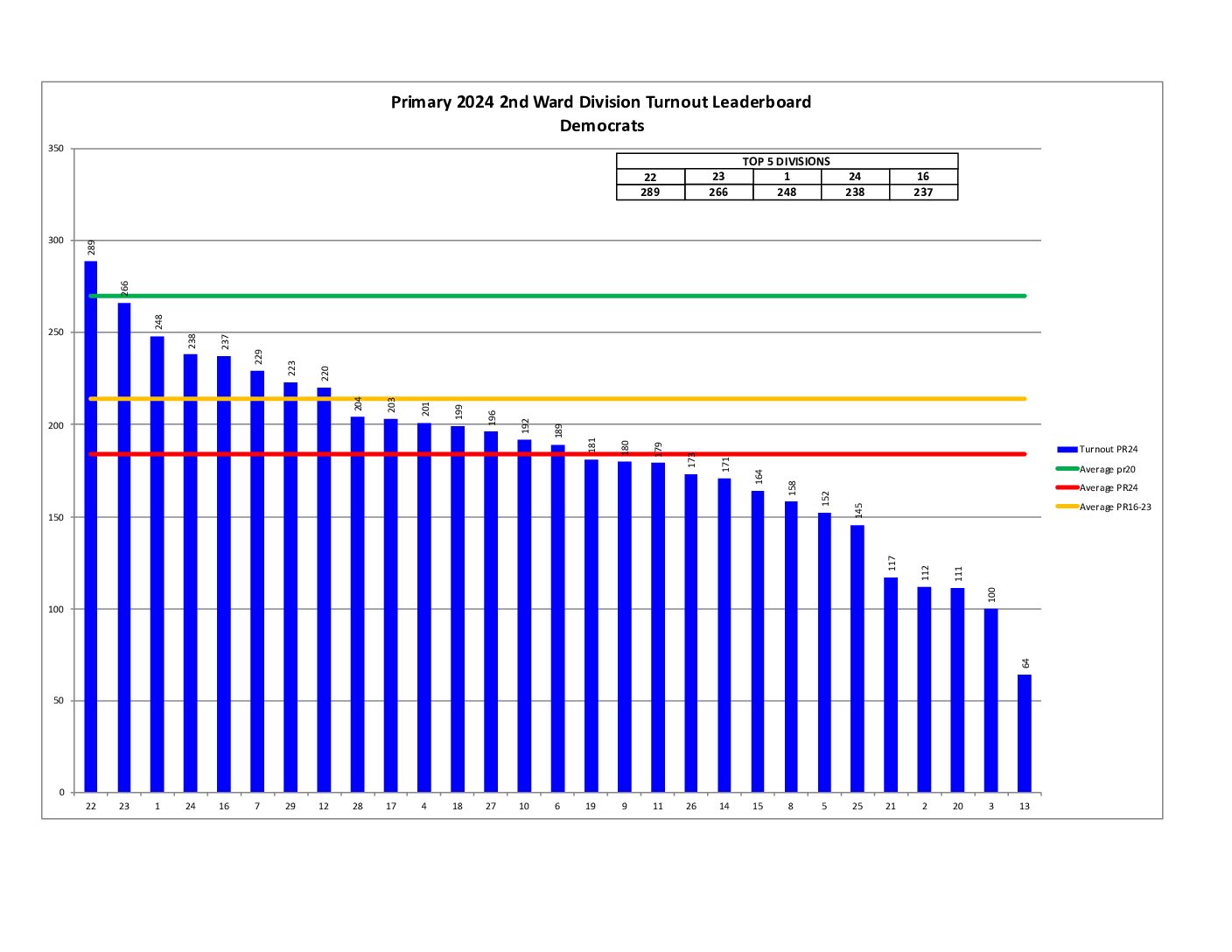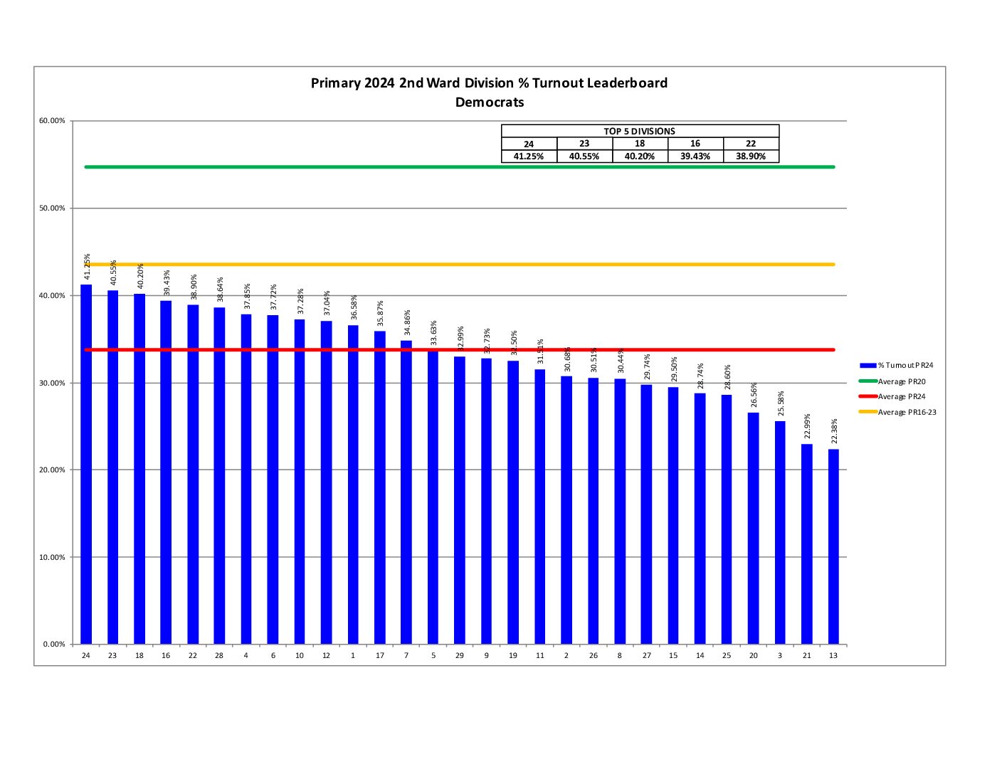 We beat the city percent turnout by about 11%. Unfortunately, turnout was way down across the board compared to the last comparable primary in 2020. Check out the leaderboard below for how we finished city-wide and also for how our divisions performed.