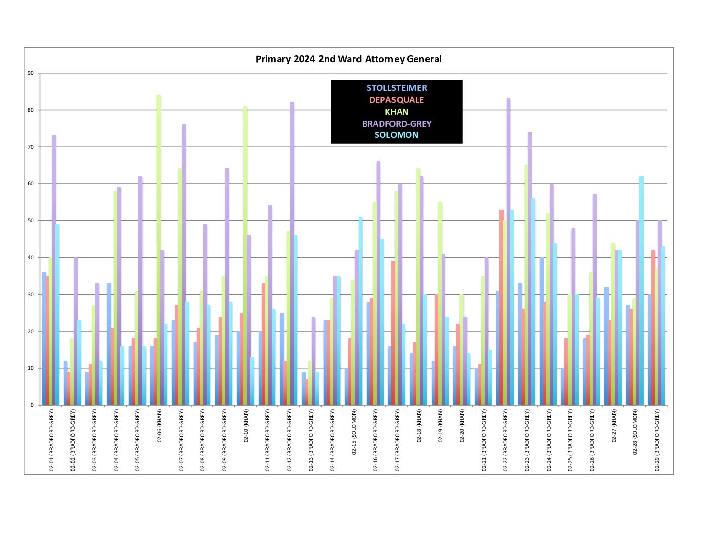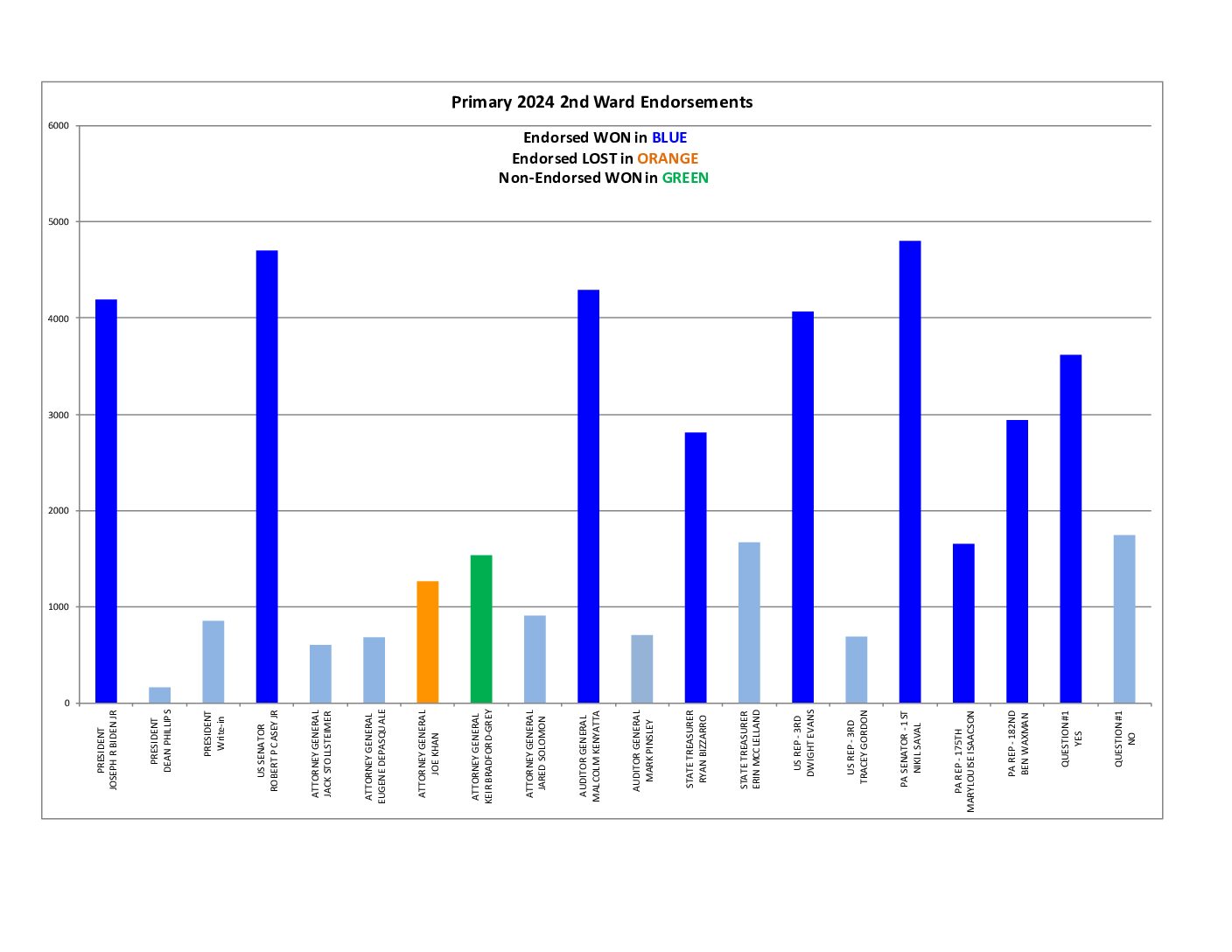 - PA Attorney General: We did not carry our endorsed candidate Joe Khan. Keir Bradford-Grey won the ward and city, but Eugene DePasquale prevailed statewide.