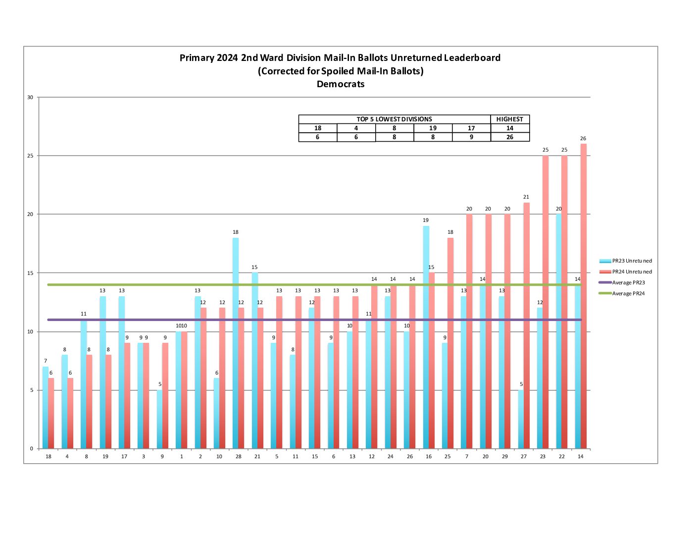 For the top five spots in the 2nd Ward, Division 24 came in first, followed by 23, 18, 16, and 22.