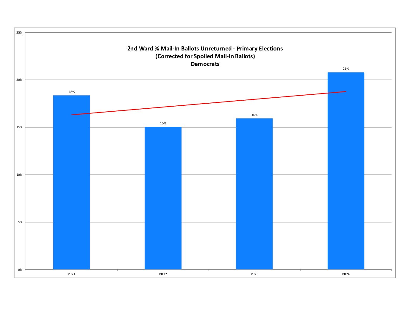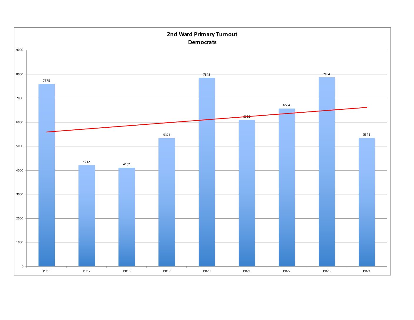 In terms of raw votes, the city is in a downward trajectory while the 2nd Ward is trending up. (Some good news for us.)