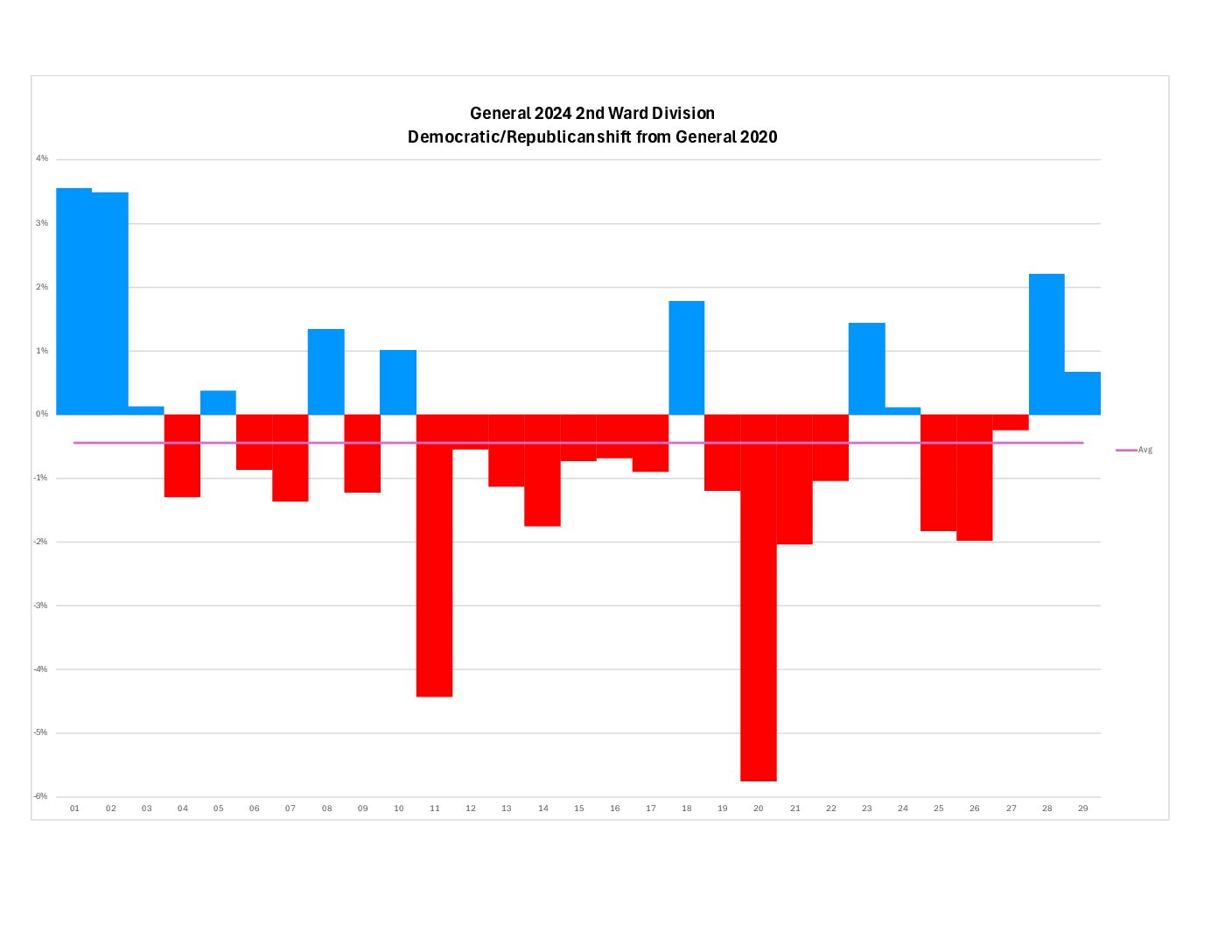The city shows a 7.3% decrease while the 2nd Ward shows a 0.1% decrease compared to the average of 2016-2024 General Elections.