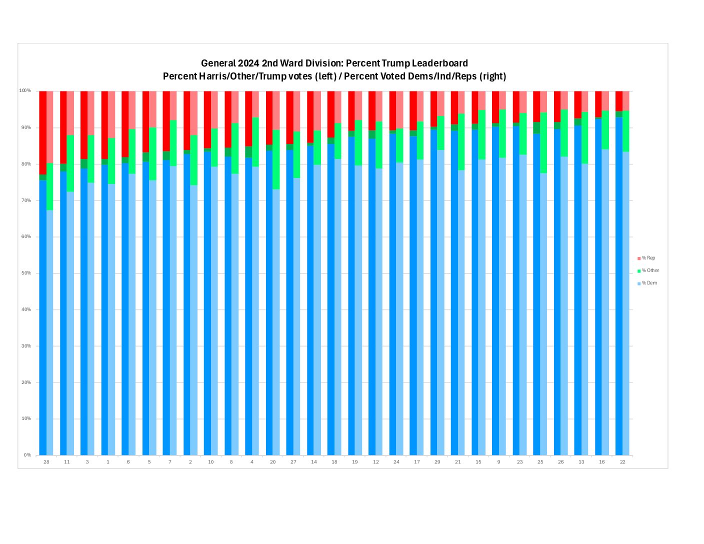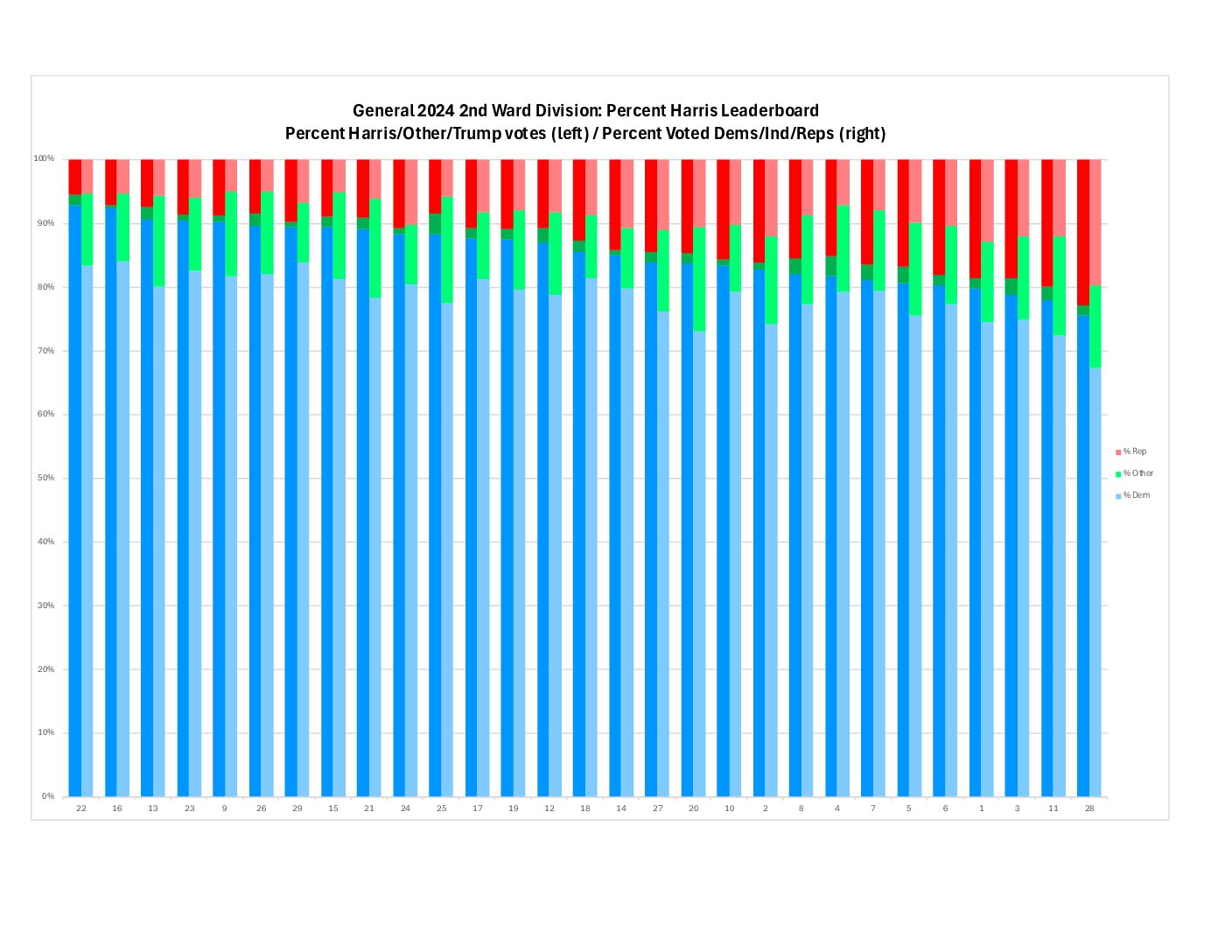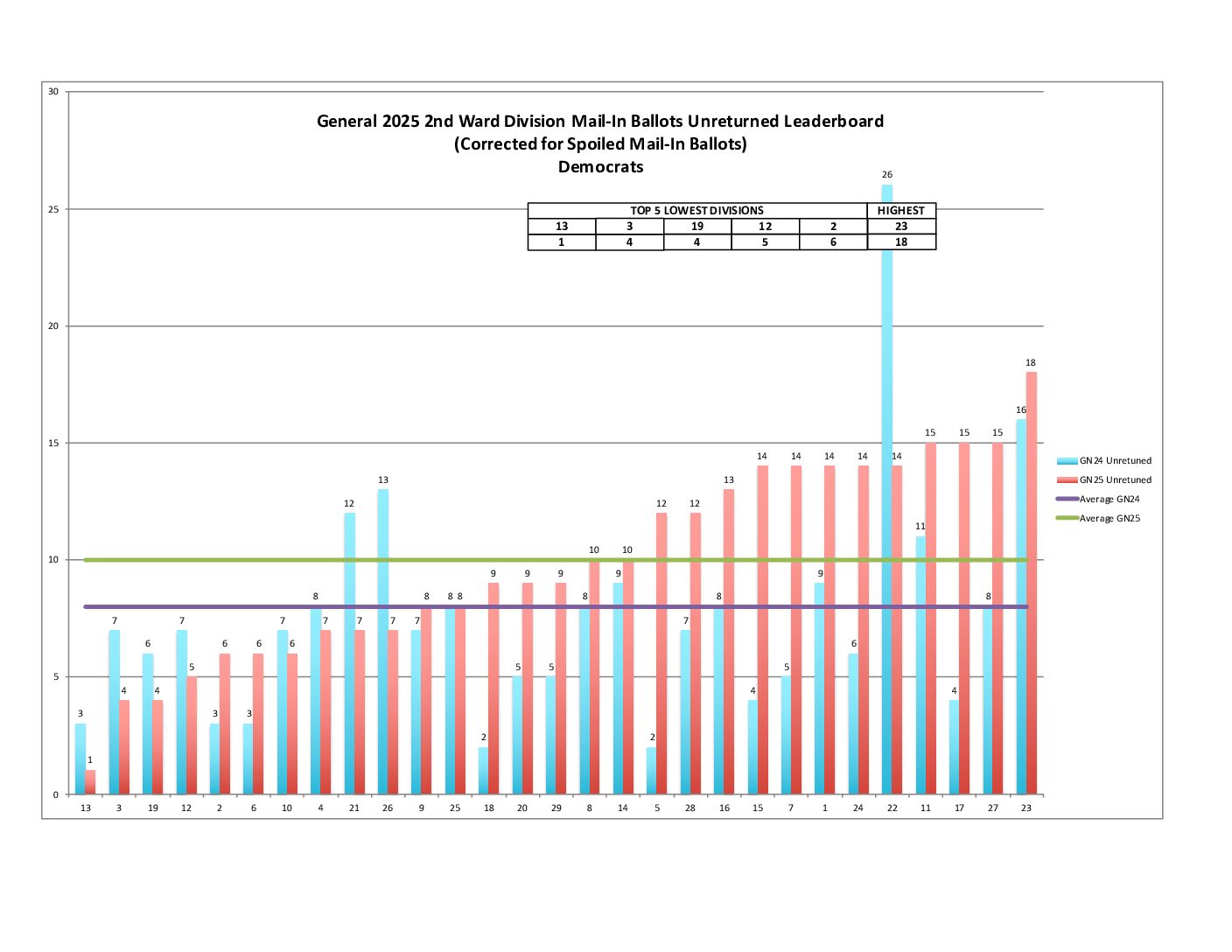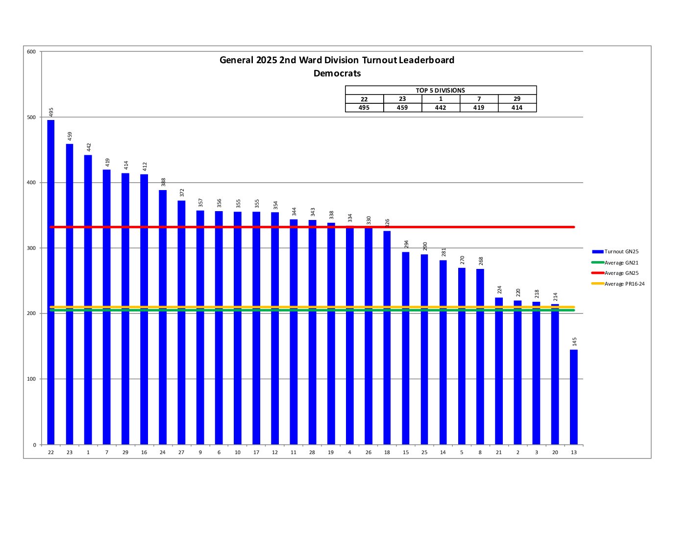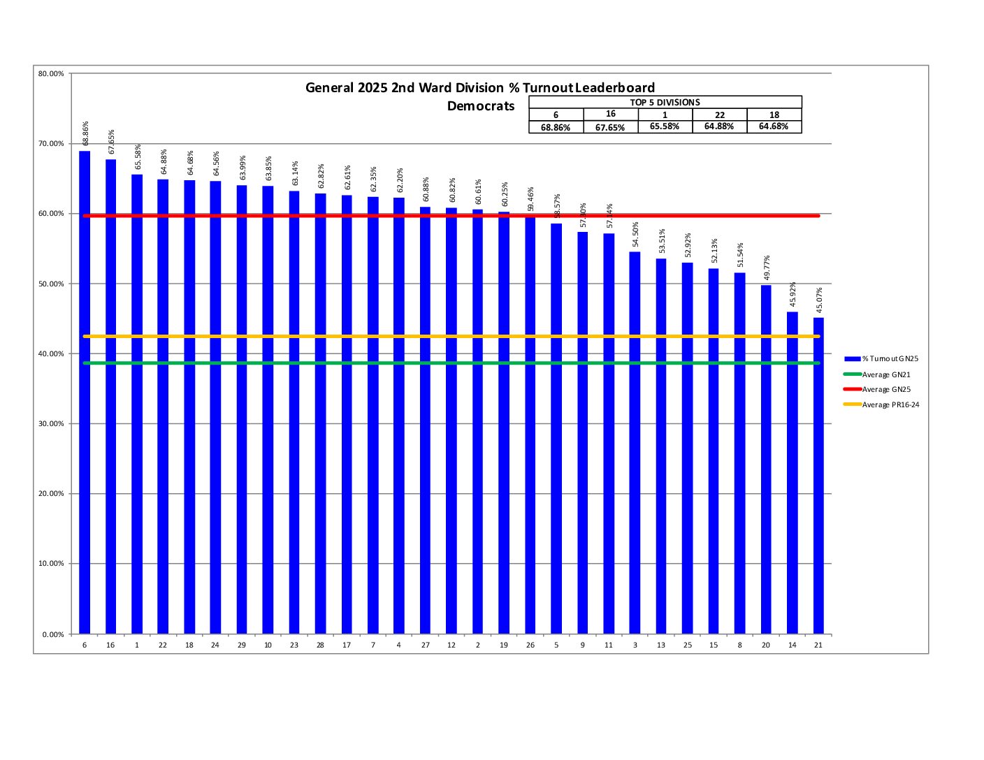 City turnout of 40.8% shows a 17% increase over the comparable 2021 General Election. 2nd Ward turnout saw a 21% increase compared to the 2021 General Election. Check out the leaderboard below for how we finished city-wide and also for how our divisions performed.