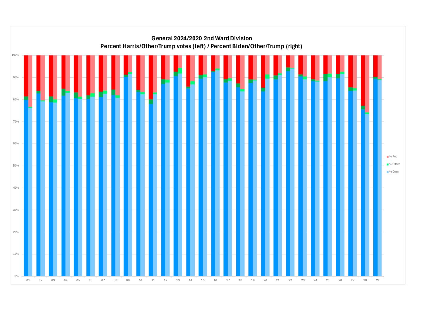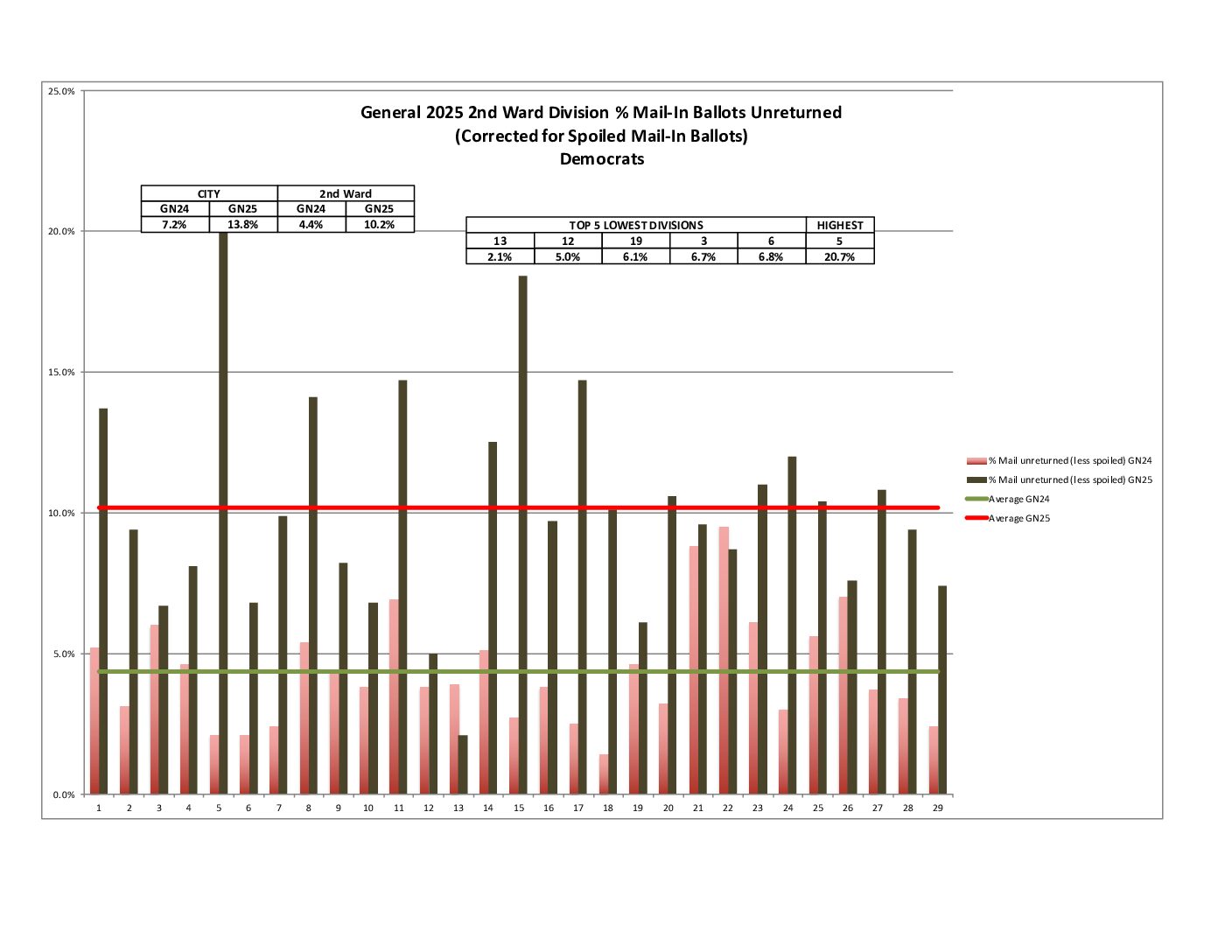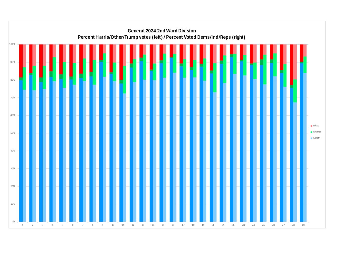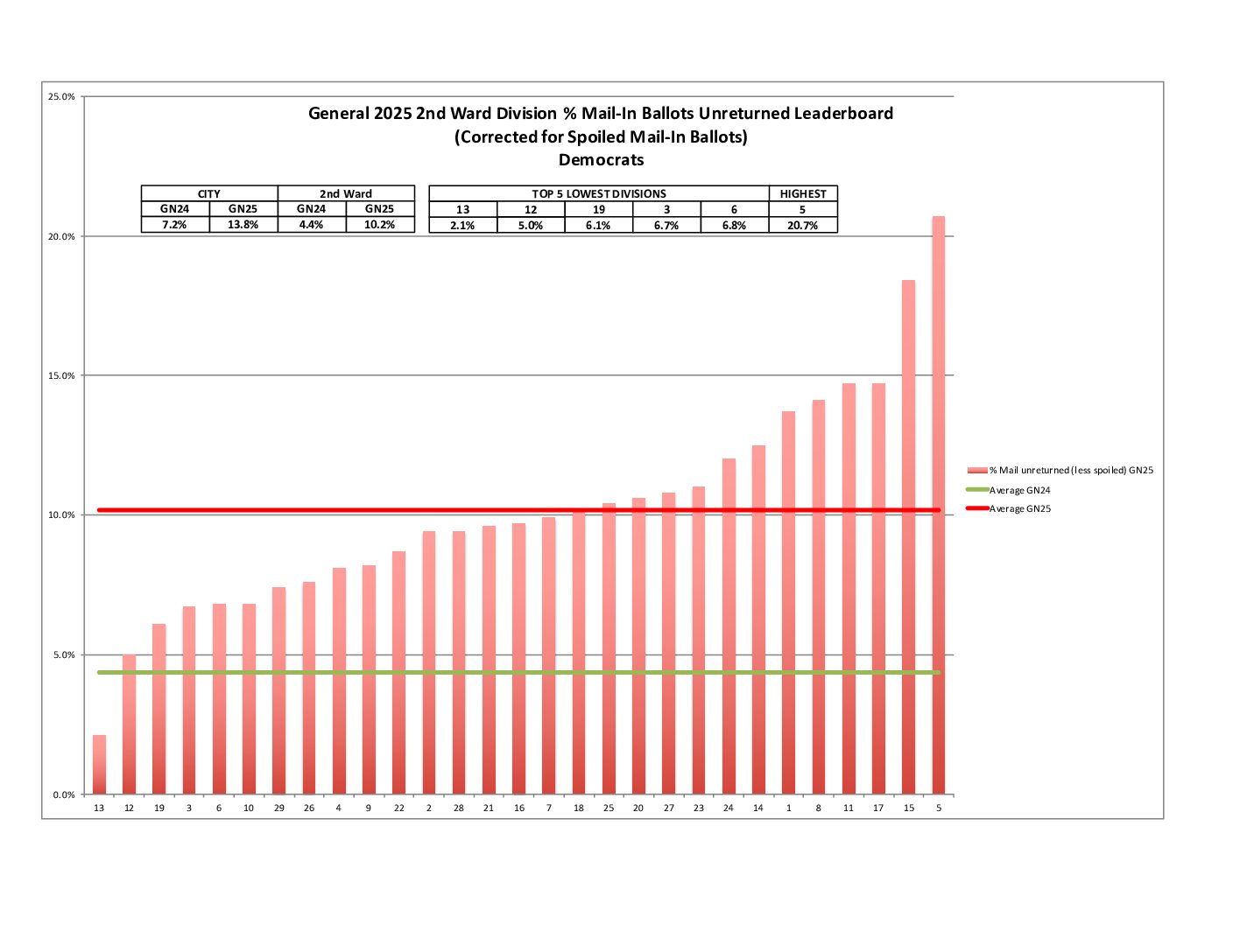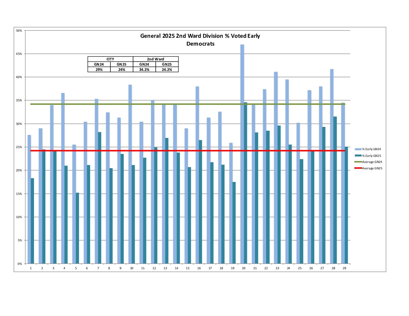 City turnout of 40.8% shows a 17% increase over the comparable 2021 General Election. 2nd Ward turnout saw a 21% increase compared to the 2021 General Election. Check out the leaderboard below for how we finished city-wide and also for how our divisions performed.