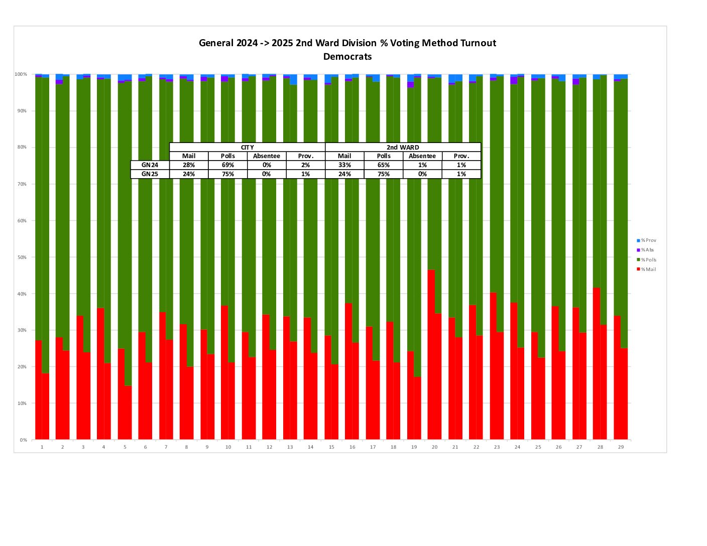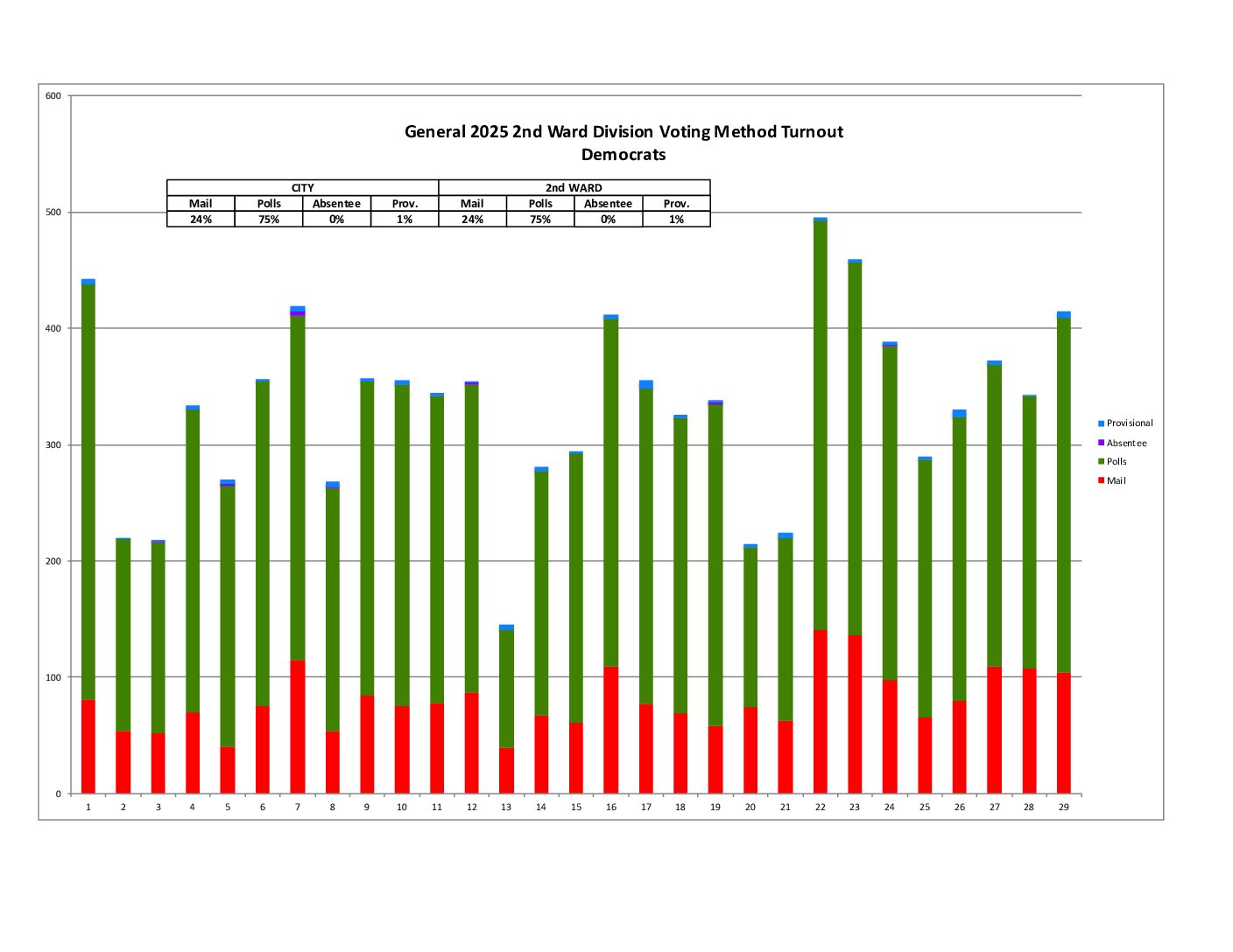 This shows the raw number of votes cast per ward and division broken into Mail, At Polls, Absentee, and Provisional. The 2nd Ward showed similar results with the city for all methods of voting.